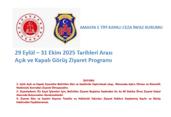 - 26 EylülAMASYA E TİPİ KAPALI CEZA İNFAZ KURUMU29 Eylül - 31 Ekim 2025 Açık ve Kapalı Ziyaret Görüş Programı