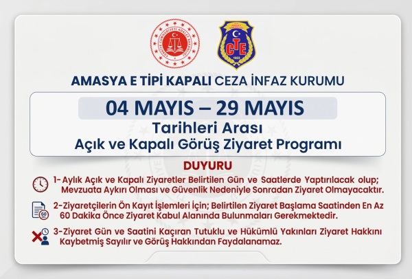 04 Mayıs - 29 Mayıs 2026 Tarihleri Arası Açık ve Kapalı Ziyaret Görüş Programı